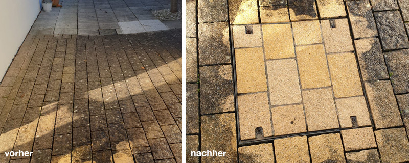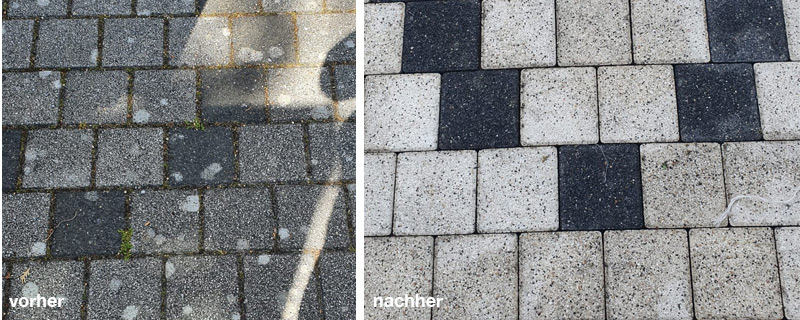 Wir arbeiten mit professionellen Flächenreinigern. Die machen den Stein nicht rau und porös. Er ist die perfekte Lösung für Ihre Steine. Wir reinigen ohne Hochdruck und ohne Chemie.